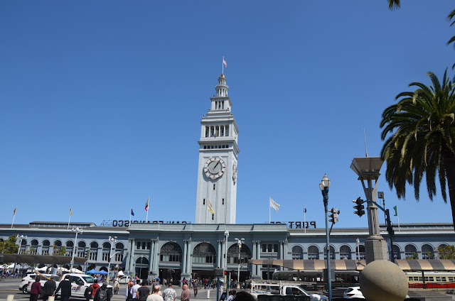 Salimos de Dolores y cogemos un tranvía dirección al "Ferry Building", edificio en el muelle, donde en el exterior los martes (y hoy lo es) se monta un mercado de fruta y verdura y dentro hay varios espacios de restauración. Antes de llegar, nos bajamos un poco antes en la calle Market para admirar más de cerca los edificios altos de oficinas que ya vimos un poco a distancia el día de ayer.Cogemos de nuevo el Tranvía , que en dos paradas nos deja en el Ferry Building. Damos una vuelta por fuera y por dentro, donde hay mucha animación con gente ya comiendo en los variados restaurantes que allí están establecidos.